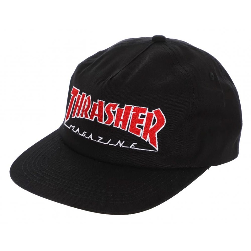 The Thrasher Outlined Snapback Cap in Black features Thrasher's magazine logo across the front in red.